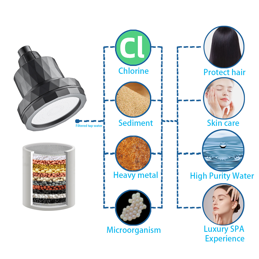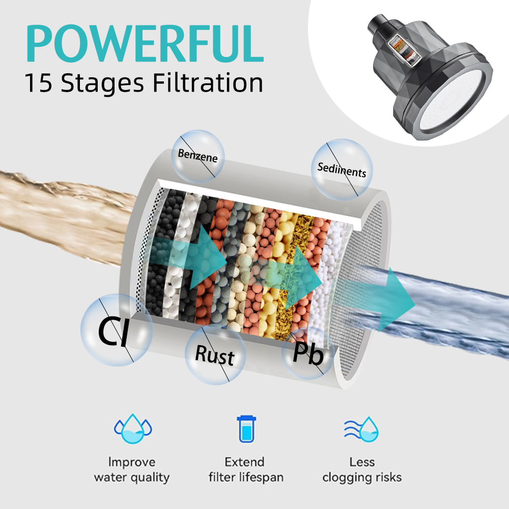 - Advanced filtration: 15-stage Vitamin C filter with multi-layer protection to reduce chlorine and mineral effects, soften water, and help maintain skin and hair health.