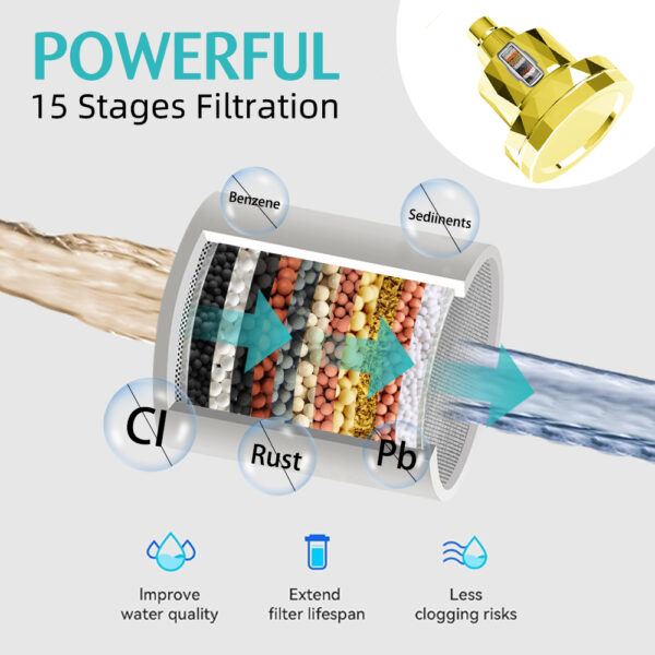 Multi-layer filter protection, soften hard water, keep water’s PH Balance. Helps restore healthier and smoother skin, softer and stronger hair