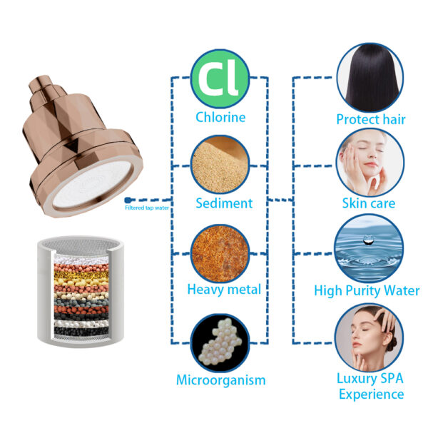 - Filtrering: Flerskiktsfilterskydd som minskar effekterna av hårt vatten och avlägsnar klor och föroreningar för att förbättra vattenkvaliteten.